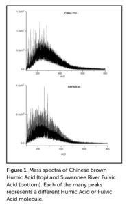 For centuries, humic acids (HA) were thought to be composed of much larger molecules than those found in fulvic acids (FA). However, the application of Fourier-transform ion cyclotron resonance mass spectrometry (FT-ICR MS), which separates molecules on the basis of molecular weight, demonstrates that the molecular weights of the two fractions both fall in the range of 200–800 Daltons (Da), with most of the molecules having molecular weights in the range of 200–400 Da (Figure 1). To give context, carbon (C) weighs 12 Da, oxygen (O) weighs 16 Da, and hydrogen (H) weighs 1 Da. Thus, phenol molecules (an aromatic organic compound, also called carbolic acid), which have 6 C, 1 O, and 11 H atoms, weigh 99 Da.